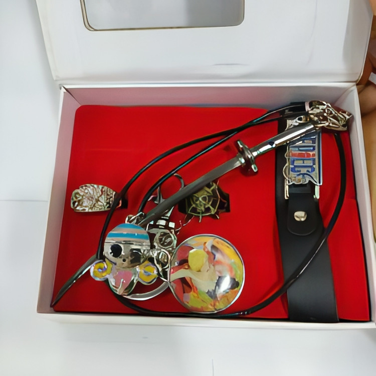 «ست کلکسیونی وان پیس شامل شمشیر مینیاتوری، کلیدساز کلاه چوپر، کلیدساز شیر، کلیدساز دایرهای با تصویر شخصیت، قطعه فلزی شبیه سکان کشتی و دستبند مشکی با لوگوی رسمی One Piece است. این باکس ویژه با طراحی دقیق و کیفیت بالا، انتخابی عالی برای کلکسیونرها و طرفداران انیمه وان پیس و هدیهای خاص برای دوستداران دنیای لوفی و همراهانش.»