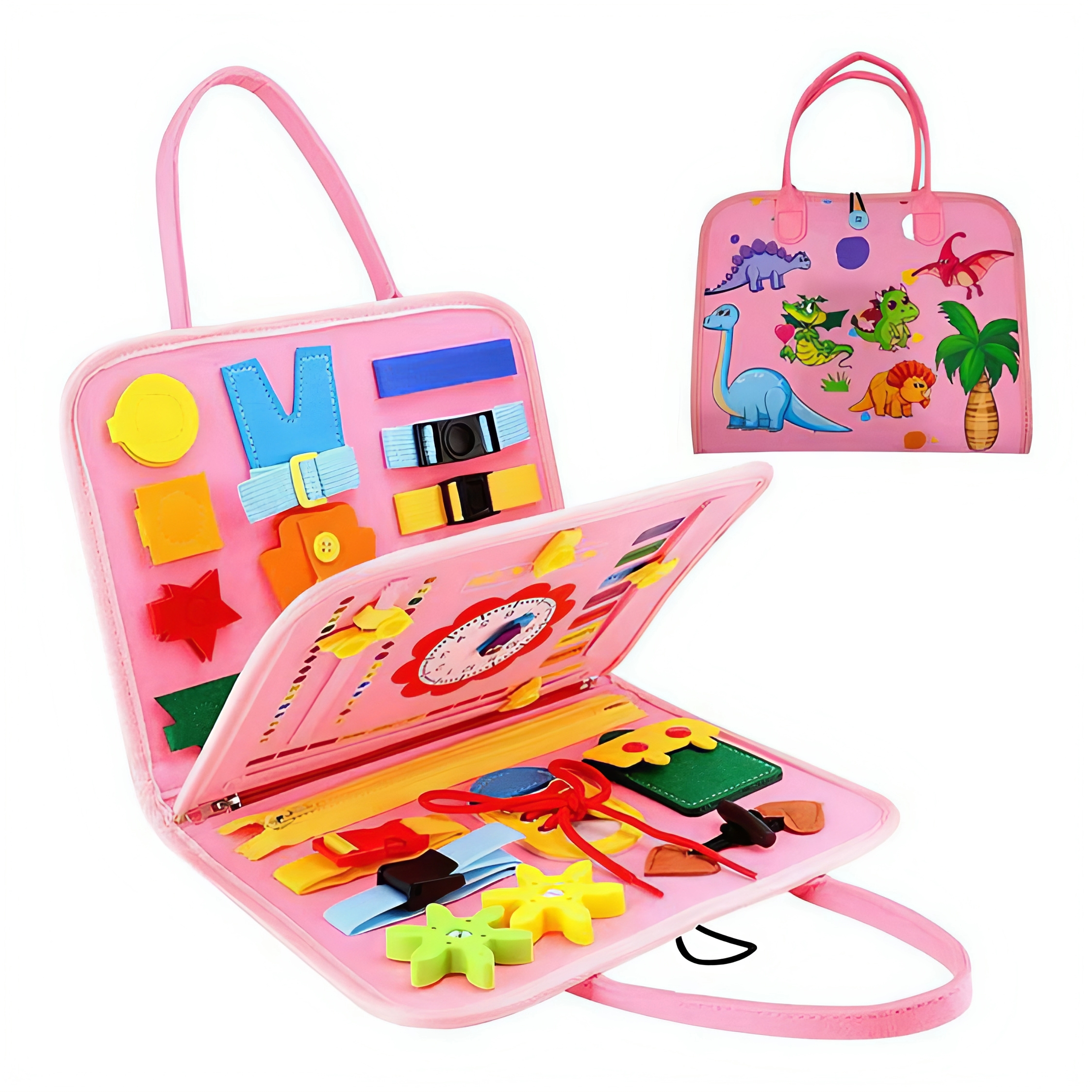 کیف مهارت های دستورزی(بیزی بوک) و مونته سوری دایناسور صورتی ۳ برگی(۴ صفحه)